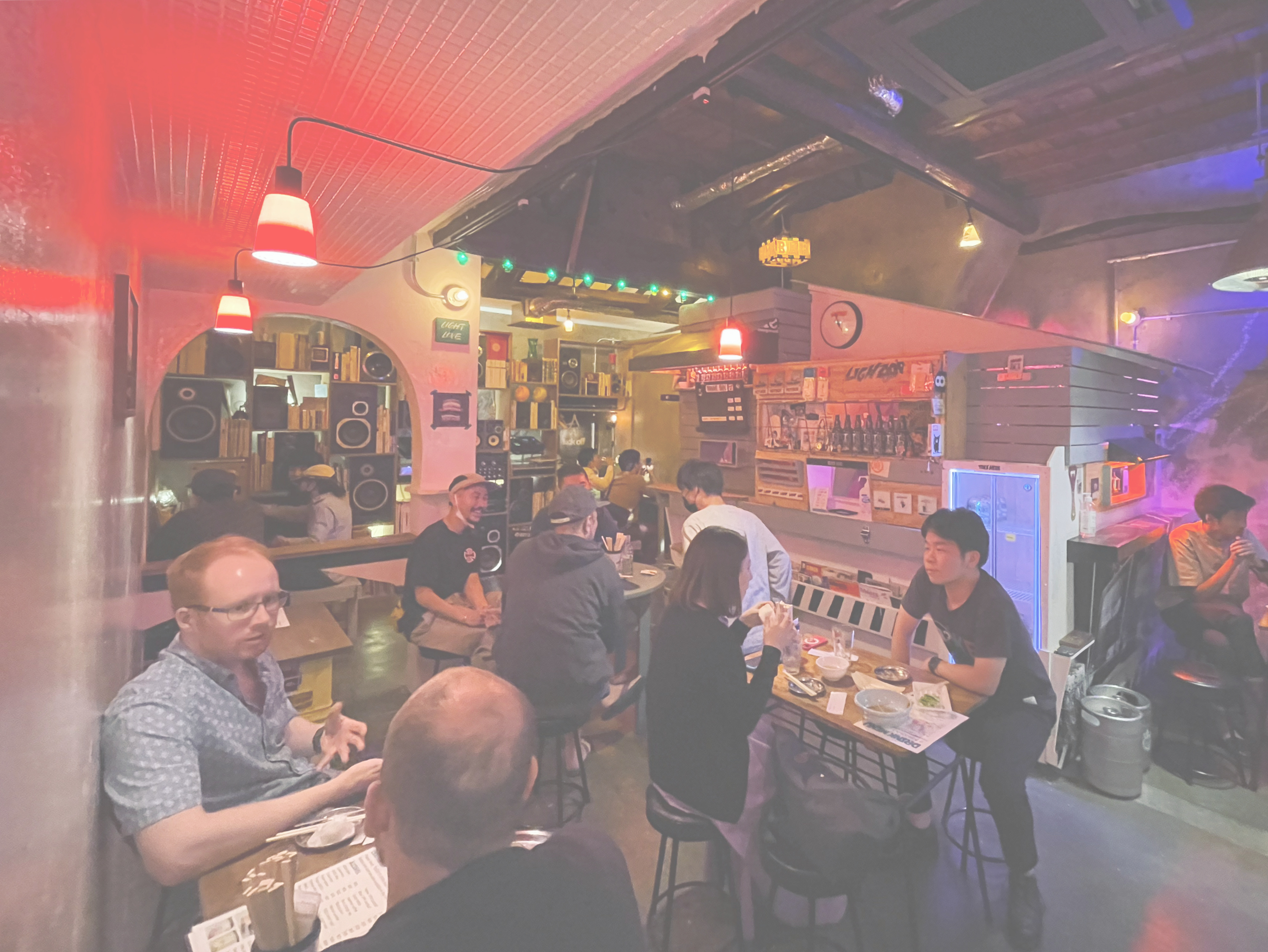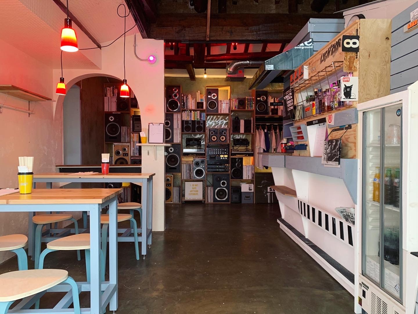 スピーカーと書籍などが詰め込まれた壁から流れる音楽。